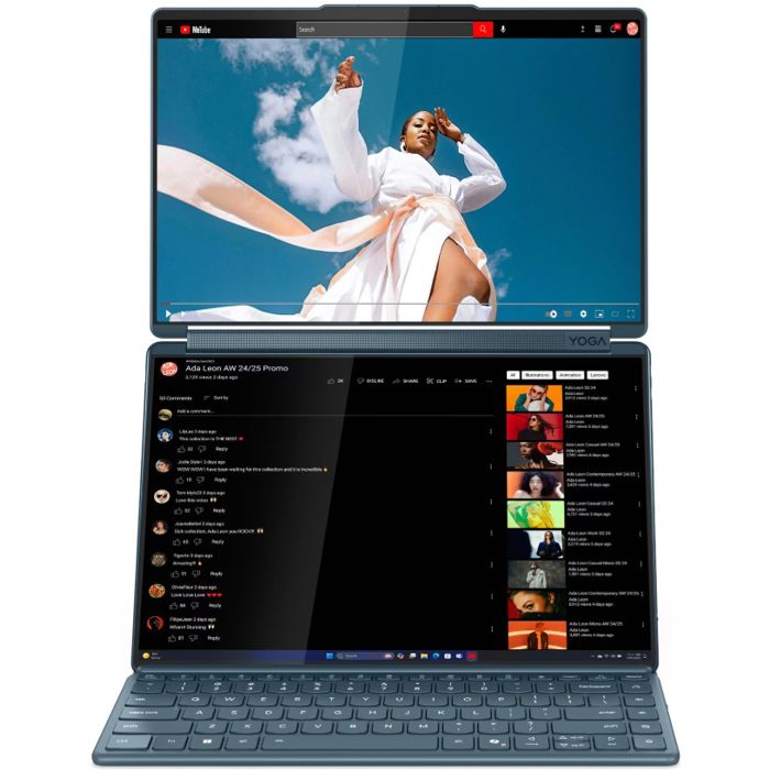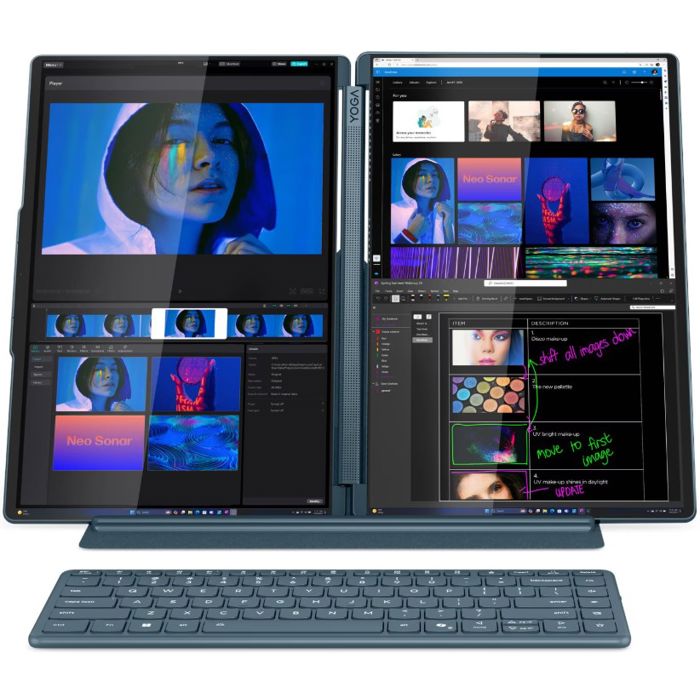 Notebook LENOVO Yoga Book 9 14IAH10, 2", Ultra 7 255H, 32GB RAM, 1TB SSD dolazi s konfiguracijom koja uključuje Intel Core Ultra 7 255H, 32 GB LPDDR5x (soldered), 1 TB PCIe Gen4 SSD, Intel Arc (integrated, Arc 140T variant listed in specs), 2x 14.0" 2880 x 1800 (2.8K WQXGA+), 16:10 POLED (OLED) PureSight, Windows 11 Pro / Windows 11 Home (ovisno o konfiguraciji).